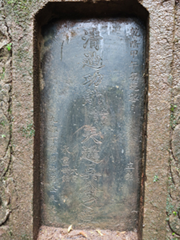 諱天選号静庵 欽授迪功郎 生於康熙丁卯年正月初一日卯時卒於乾隆乙酉年五月二十日戌時元配陳氏生於康熙壬申年八月初四日辰時卒於乾隆壬戌年九月廿九日辰時继配李氏生於康熙甲午年十二月初九日亥時卒於乾隆乙卯年四月十七日酉時生男三墳在十八都青坑四石件坐卯酉兼甲庚分金